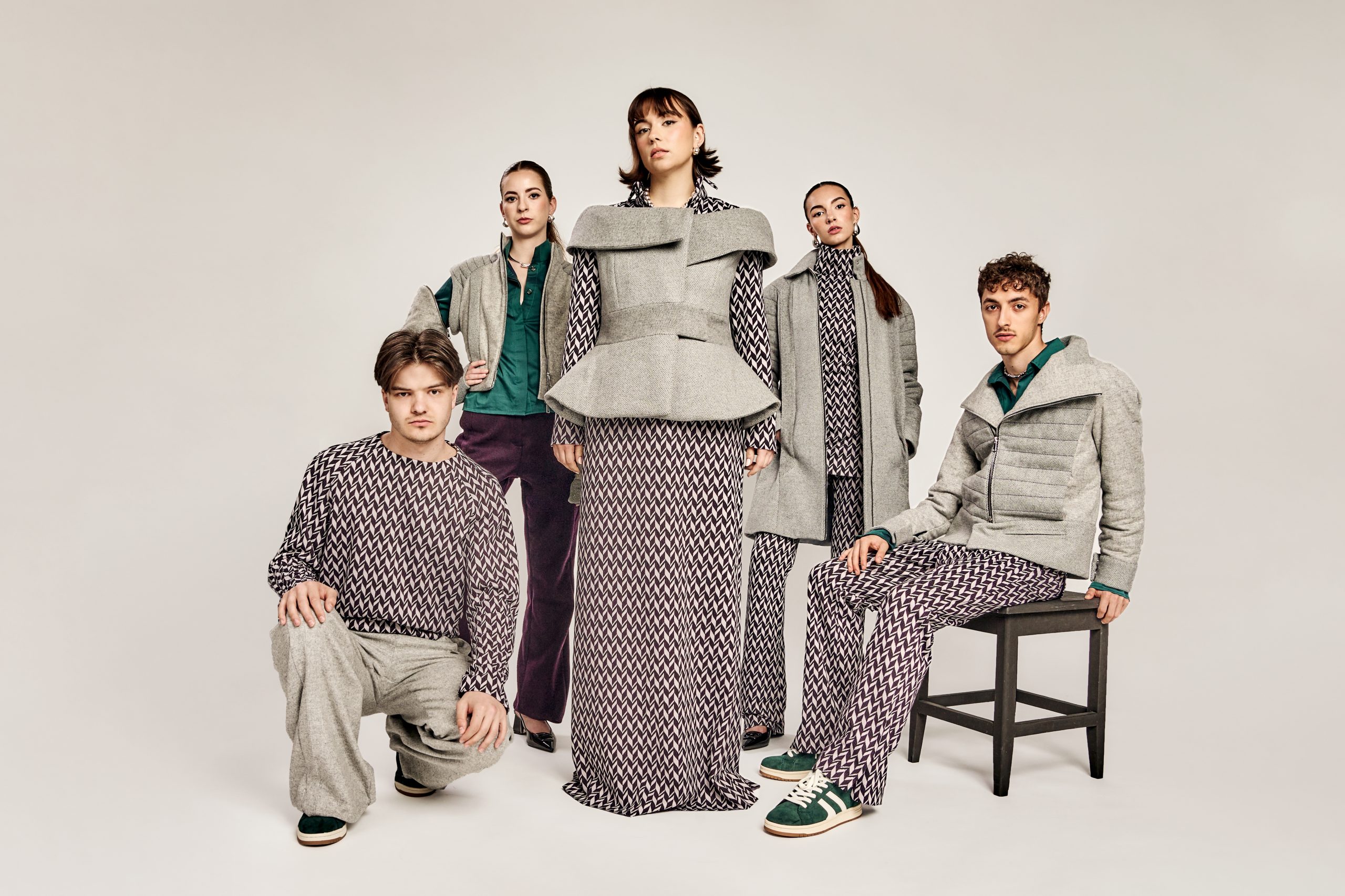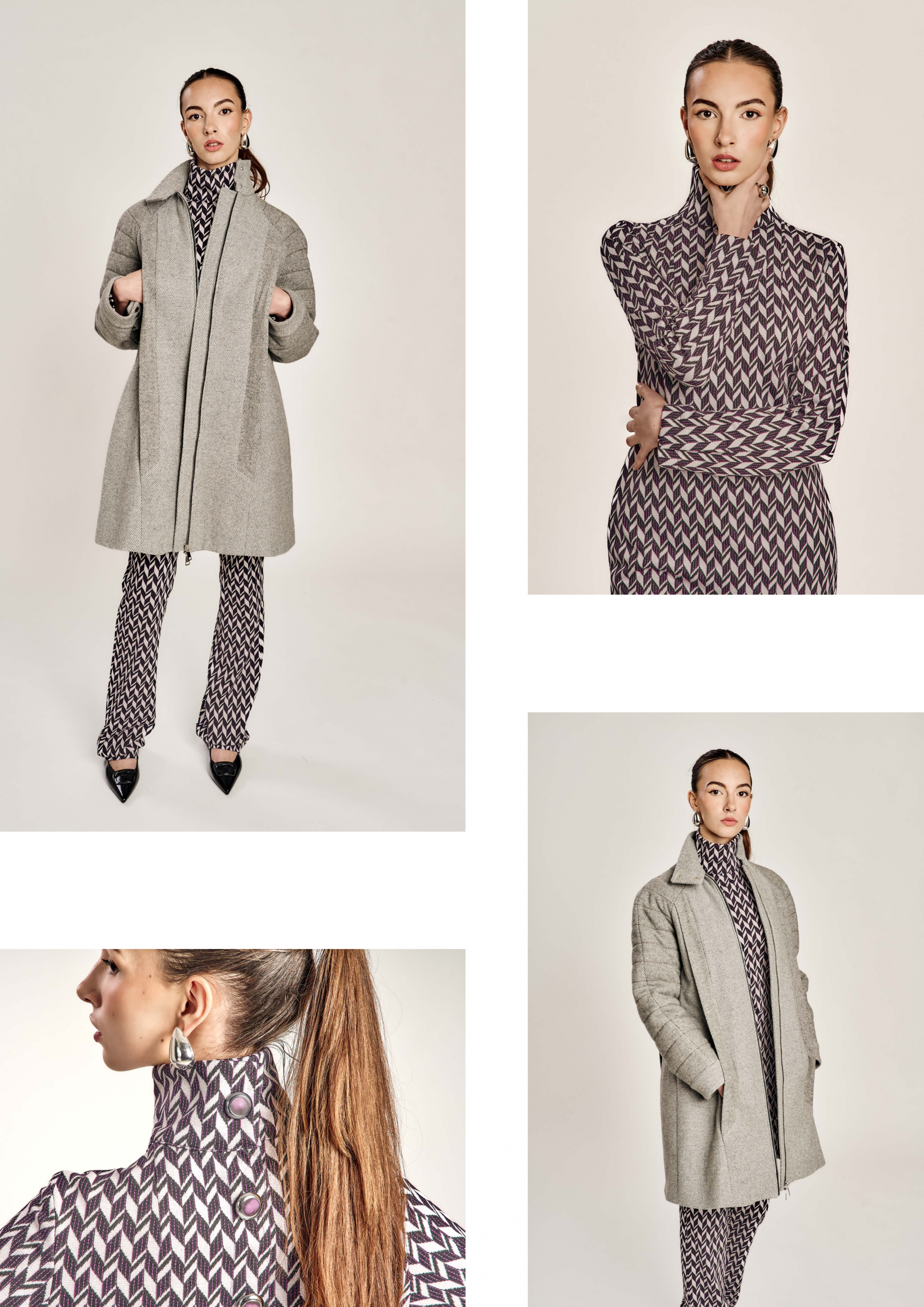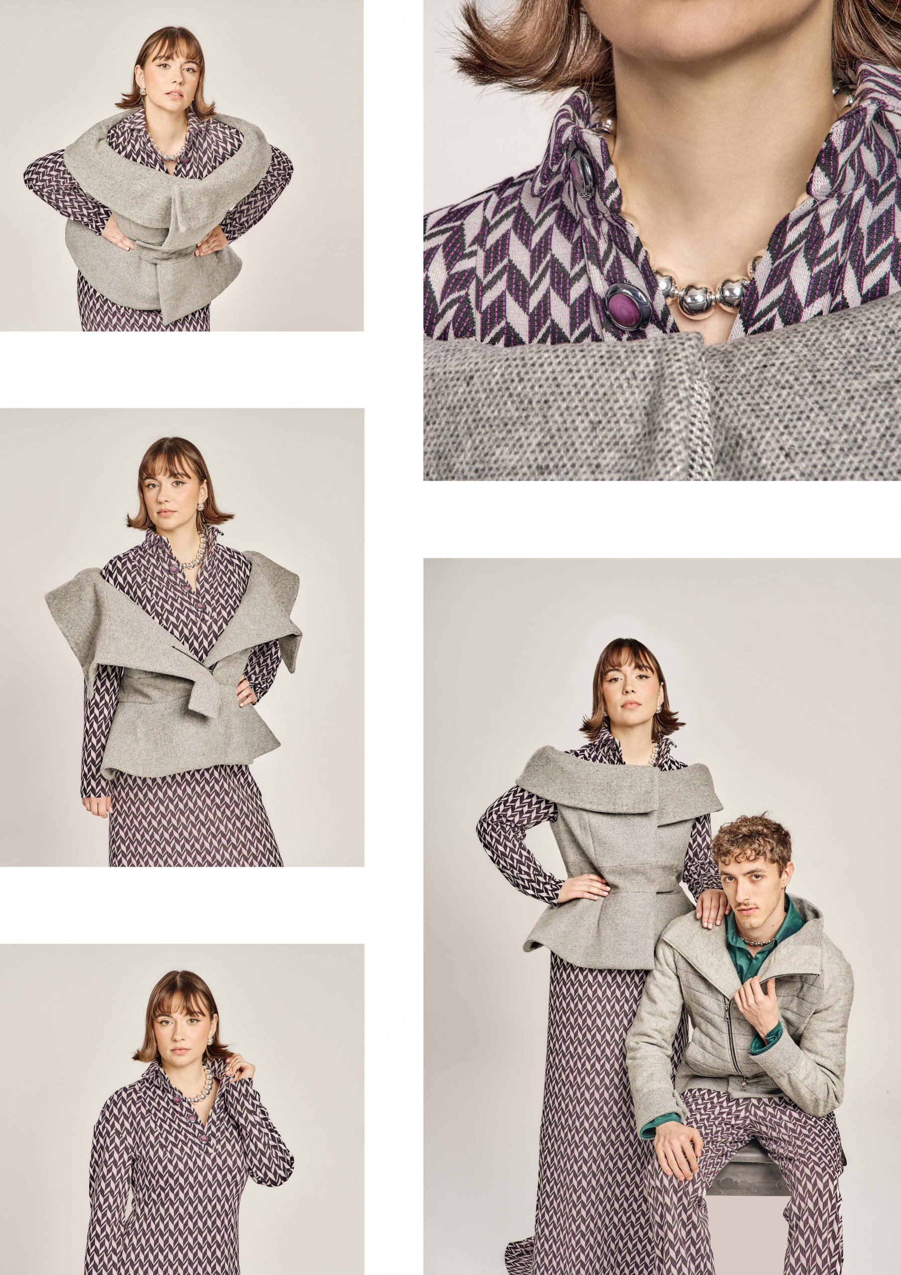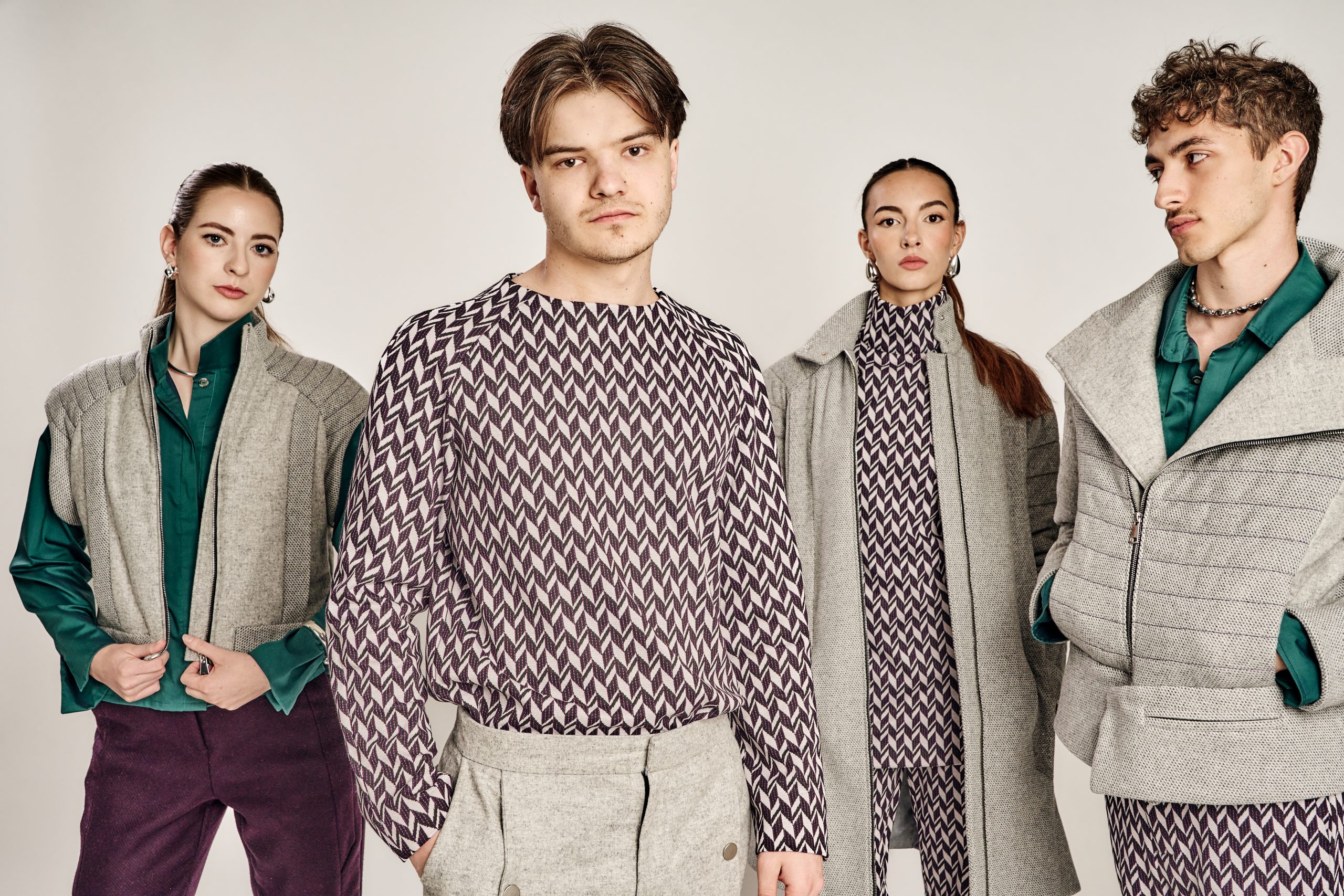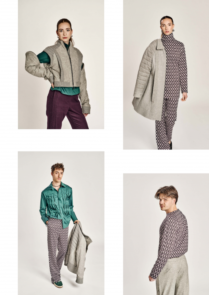 Zurückhaltung trifft auf Ausdruck, Klassik auf Zeitgeist – die Kollektion lebt vom bewussten Spiel der Gegensätze. Klare, kühle Wollstoffe treffen auf laute Muster und satte Farben; feine Schneiderkunst begegnet mutigen Proportionen. Dieser Dialog zwischen Alt und Neu, Leise und Laut, zieht sich wie ein roter Faden durch alle Entwürfe.