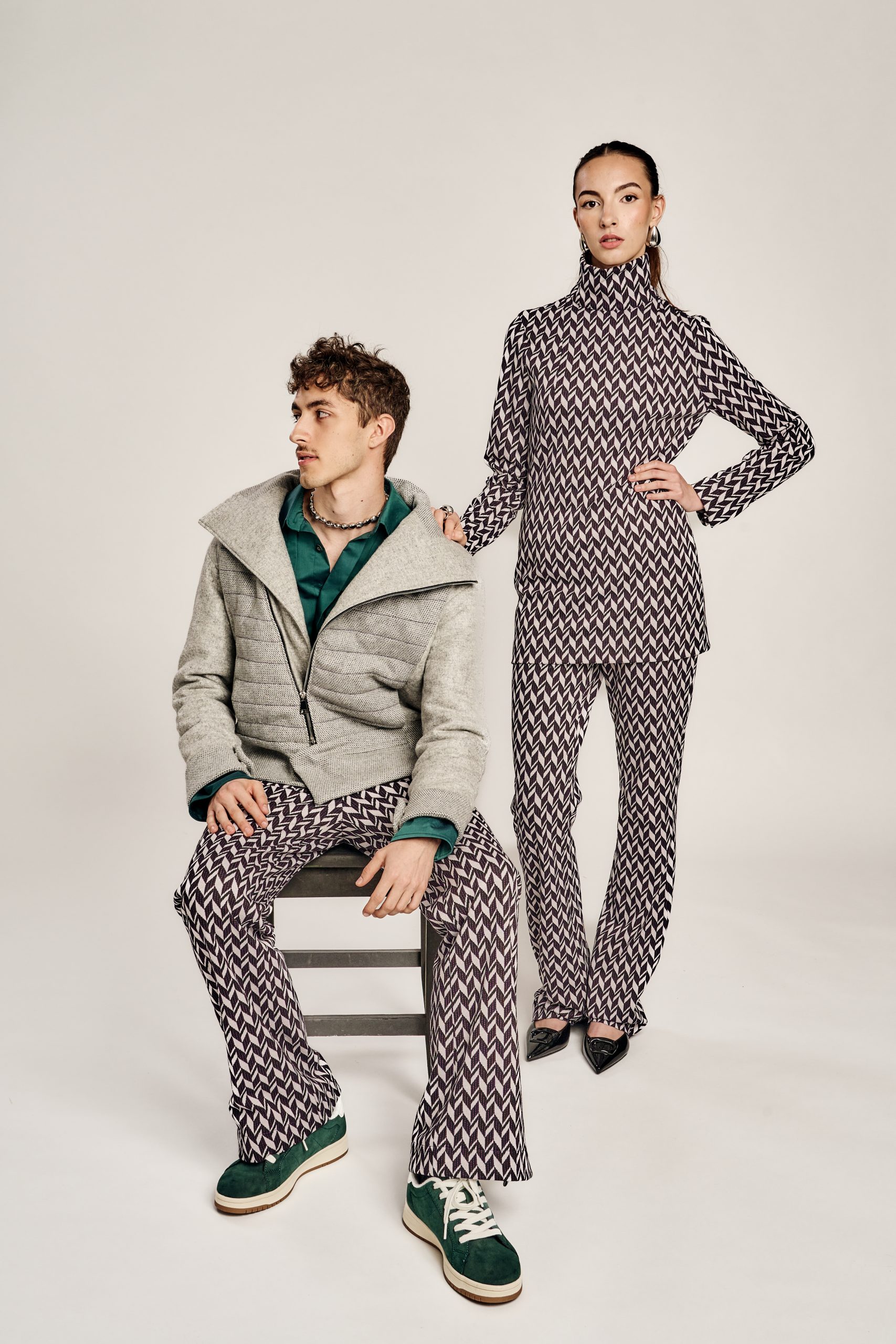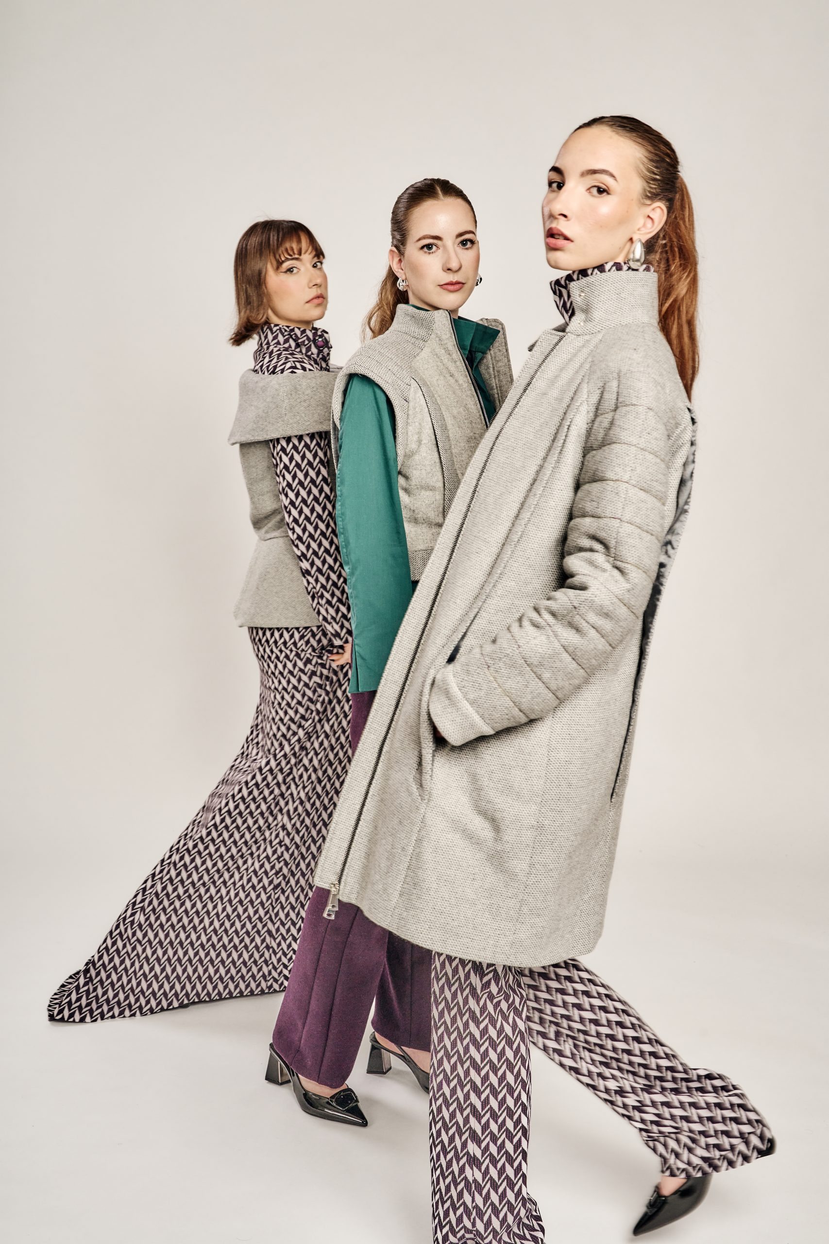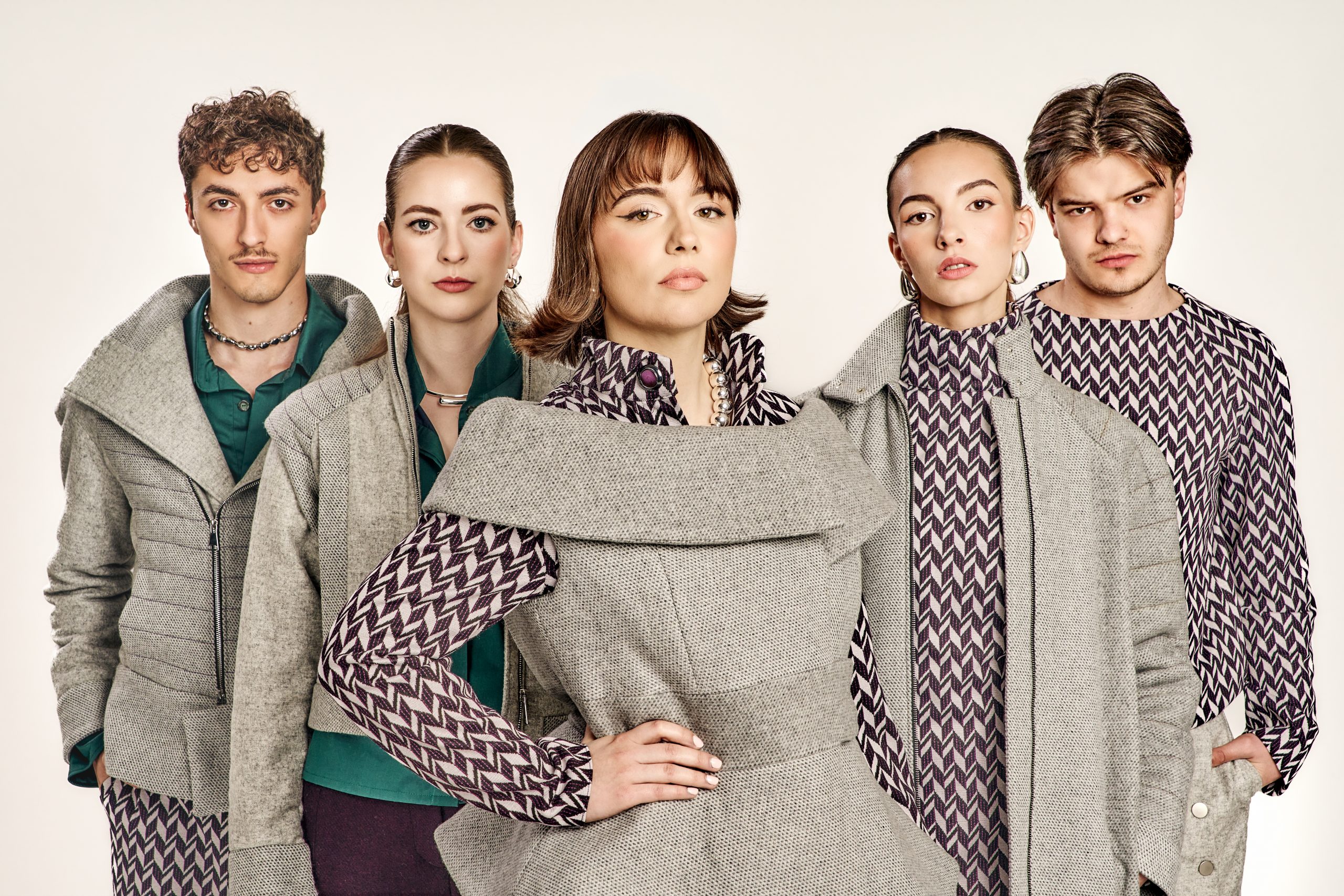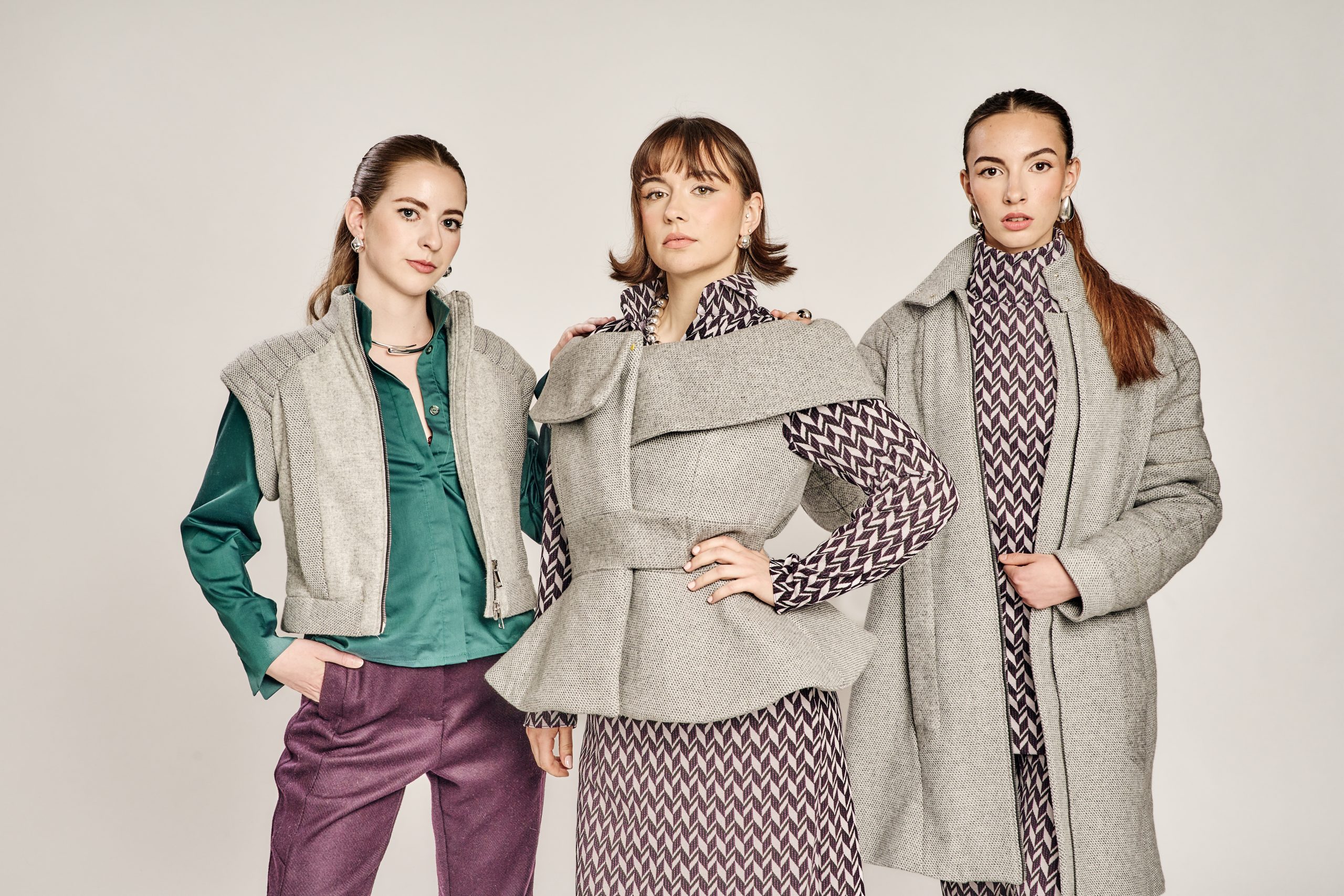 Zurückhaltung trifft auf Ausdruck, Klassik auf Zeitgeist – die Kollektion lebt vom bewussten Spiel der Gegensätze. Klare, kühle Wollstoffe treffen auf laute Muster und satte Farben; feine Schneiderkunst begegnet mutigen Proportionen. Dieser Dialog zwischen Alt und Neu, Leise und Laut, zieht sich wie ein roter Faden durch alle Entwürfe.