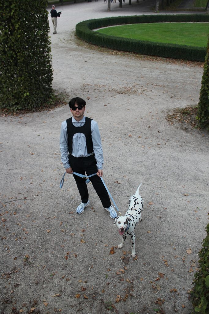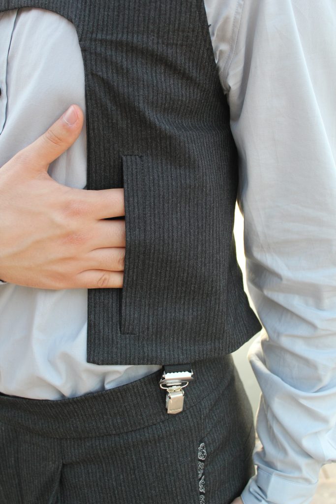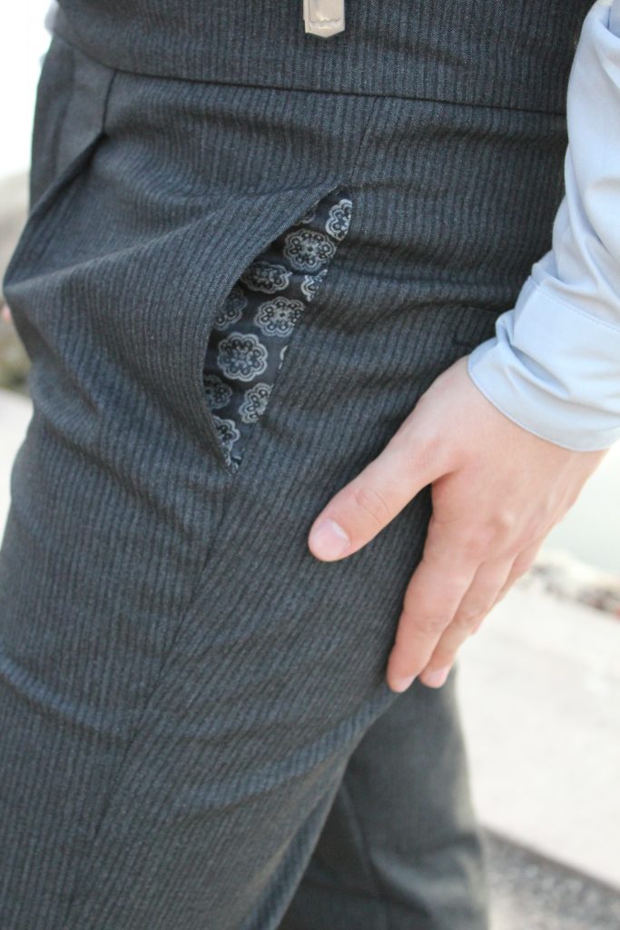 gefütterte Eingriffstaschen an der Hose, Paspeltaschen an der Jacke, die an der Hose mit Hosenträgerklammern fixiert werden kann